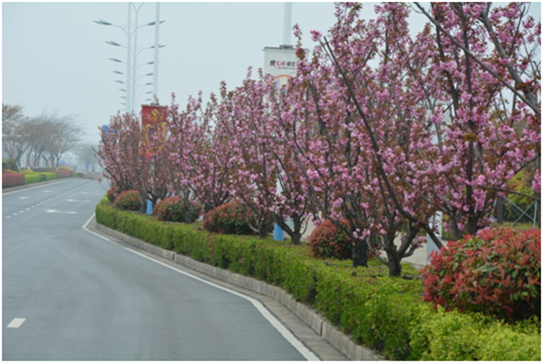 為把園區(qū)青海湖西路打造園區(qū)“櫻花大道”,按管委會(huì)部署,開(kāi)發(fā)公司市政工程管理部對(duì)青海湖西路的行道樹(shù)進(jìn)行整體更換,用櫻花代替原長(zhǎng)勢(shì)不佳的廣玉蘭,經(jīng)過(guò)兩年的精心養(yǎng)護(hù),整體長(zhǎng)勢(shì)良好,每逢春季來(lái)臨櫻花盛開(kāi),為園區(qū)的景觀增添亮點(diǎn),成為一道獨(dú)特靚麗的風(fēng)景線。