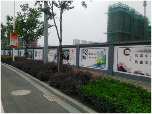 目前,現(xiàn)場各項(xiàng)安全文明設(shè)施正在緊鑼密鼓的建設(shè)中,其中臨時(shí)圍墻不僅是工地對(duì)外展示的第一形象,也是企業(yè)宣傳、安全宣傳、方案公示等信息的展示平臺(tái)。項(xiàng)目部通過人工手繪結(jié)合局部噴繪的方式既宣傳了創(chuàng)文、創(chuàng)衛(wèi)、核心價(jià)值觀的標(biāo)語,又營造了“青磚綠瓦”的江南韻味。為園區(qū)的創(chuàng)文建設(shè)增添了新的亮點(diǎn)。