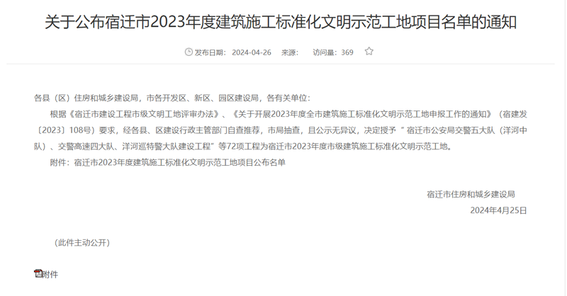 近日,宿遷市2023年度建筑施工標(biāo)準化文明示范工地項目名單發(fā)布,蘇宿工業(yè)園區(qū)智慧信息產(chǎn)業(yè)園項目榮獲2023年度市級建筑施工標(biāo)準化文明示范工地榮譽稱號。