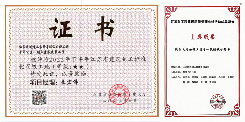 項目在施工中先后獲得了江蘇省建筑施工標準化星級工地、江蘇省綠色施工示范工程、宿遷市工程質量管理小組活動II類成果、江蘇省工程建設質量管理小組活動成果評價II類成果等榮譽,同時受到了主管部門、業(yè)界同行的充分肯定。