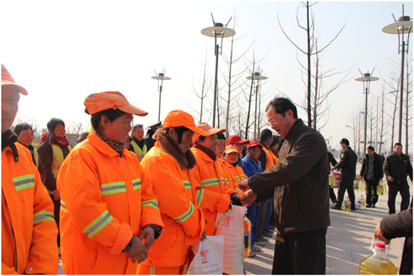 在慰問(wèn)現(xiàn)場(chǎng),周原與城市維護(hù)工人親切握手,向他們送上了米、面、油等慰問(wèn)品,感謝他們一直以來(lái)為蘇宿園區(qū)城市維護(hù)工作付出的辛勤勞動(dòng),并衷心祝愿他們春節(jié)快樂(lè)、身體健康,闔家幸福。