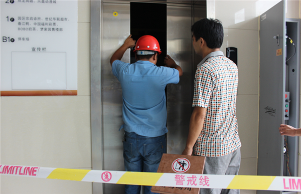 本次演練模擬在西楚金地突發(fā)的一起電梯故障困人事件而展開(kāi)的應(yīng)急救援。上午9時(shí)30分,兩名乘客乘坐西楚金地1號(hào)電梯升至4層時(shí)突然遭遇電梯停電,乘客緊急按動(dòng)報(bào)警按鈕,語(yǔ)音向中控室反映電梯突然停梯,梯內(nèi)被困乘客兩名。中控室接到報(bào)警后,立即啟動(dòng)電梯故障困人應(yīng)急救援預(yù)案,在安撫乘客的同時(shí),迅速通知工程維修中心及維保單位。相關(guān)人員迅速兵分兩路,一路到電梯機(jī)房準(zhǔn)備盤(pán)車(chē),平層施救;另一路到救援樓層4層準(zhǔn)備手動(dòng)打開(kāi)廳門(mén),營(yíng)救轎廂內(nèi)被困乘客。從接到報(bào)警求助到救援結(jié)束,整個(gè)救援工作不到8分鐘即告成功。