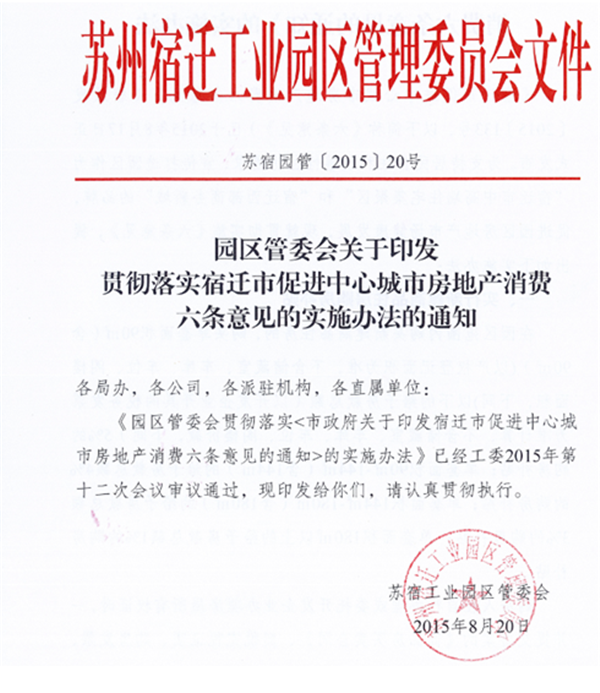 8月20日,在市政府出臺《宿遷市促進中心城市房地產(chǎn)消費六條意見》之后的第三天,園區(qū)率先出臺了《園區(qū)管委會貫徹落實<市政府關(guān)于印發(fā)宿遷市促進中心城市房地產(chǎn)消費六條意見的通知>的實施辦法》。